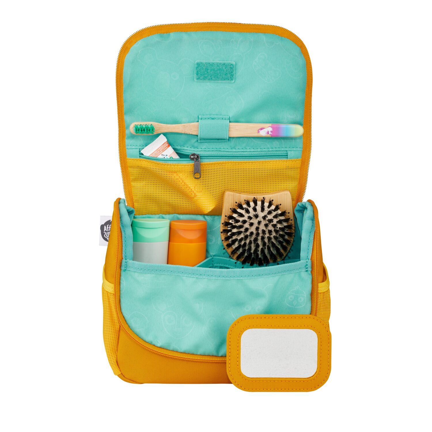 Der abnehmbare Klett-Spiegel ist flexibel und zeigt Kindern immer und überall, wie toll sie sind. Die prominente Halterung für die Zahnbürste sorgt dafür, dass sie stets zu sehen und allzeit griffbereit ist. Die Seitentaschen aus Mesh bieten Platz für Reiseartikel, die gern griffbereit sind.