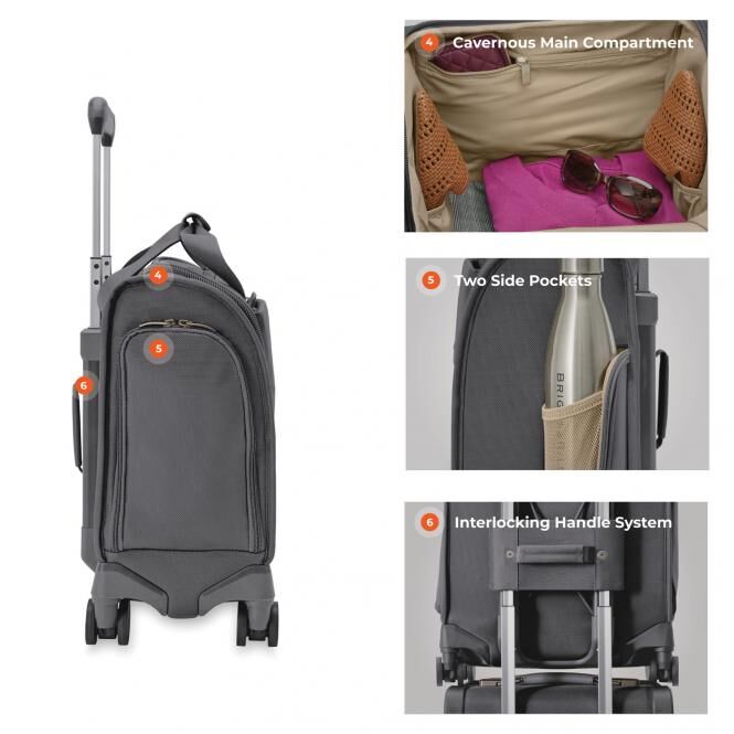 - Das ineinander greifende Griffsystem ermöglicht es, die Tasche auf andere Briggs & Riley Baseline Uprights zu stapeln und sicher zu halten, so dass zwei Taschen bequem wie eine einzige transportiert werden können