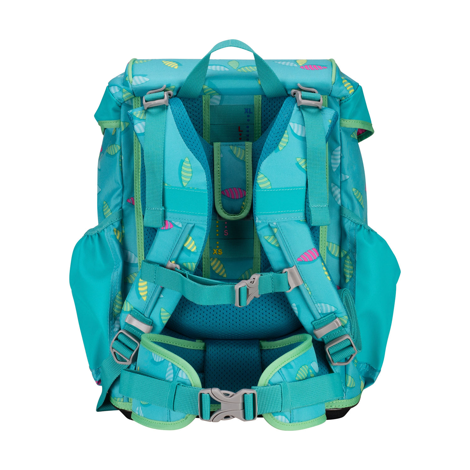 Gepolsterte Schultergurte aus Mesh in ergonomischer S-Form sind bequem zu tragen und rutschen dank längen- und höhenverstellbarem Brustgurt auch nicht. Durch die verstellbaren Lagekontrollriemen sitzt der Schulranzen außerdem besonders körpernah und rückenschonend.