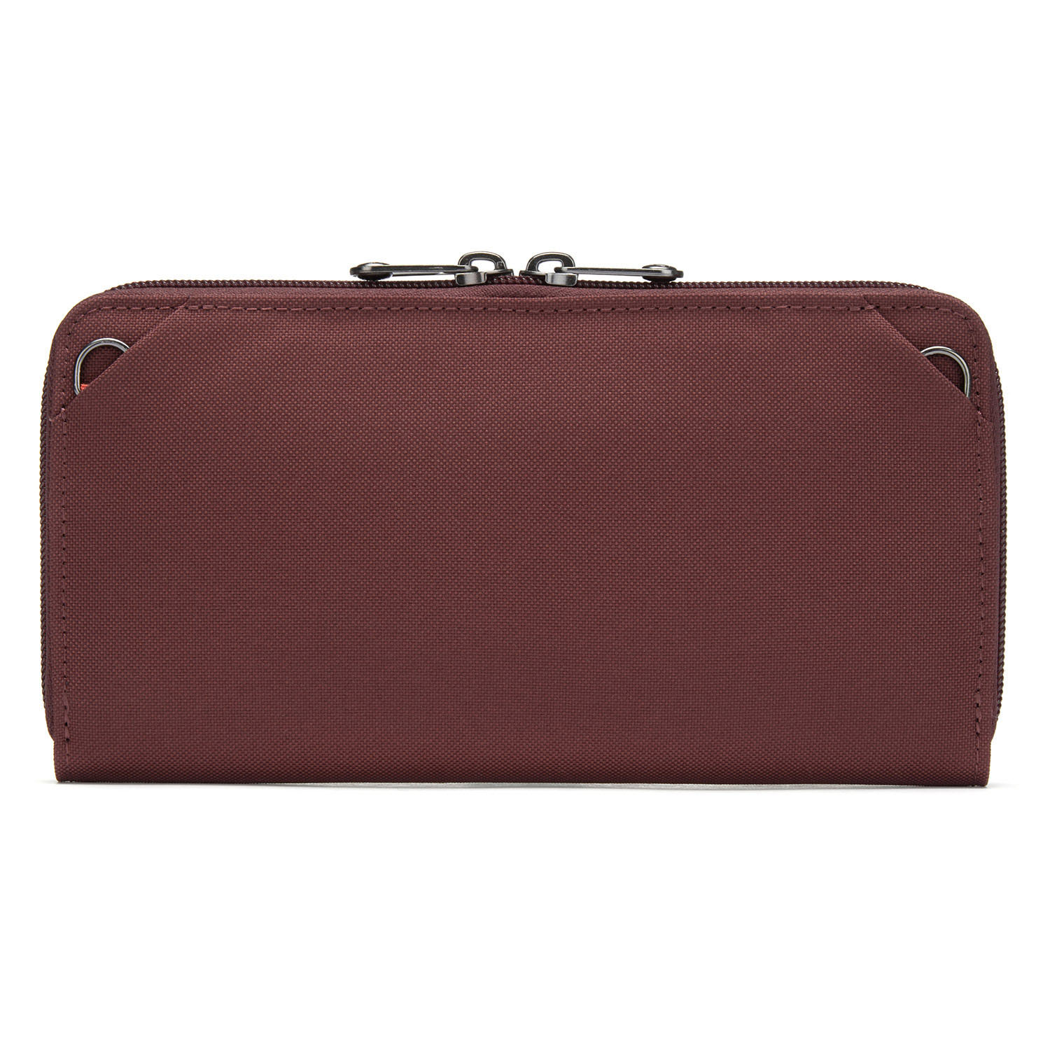 - Befestigungspunkte zum Einklippen in eine Pacsafe-Tasche oder zum Befestigen des Brieftaschengurtes