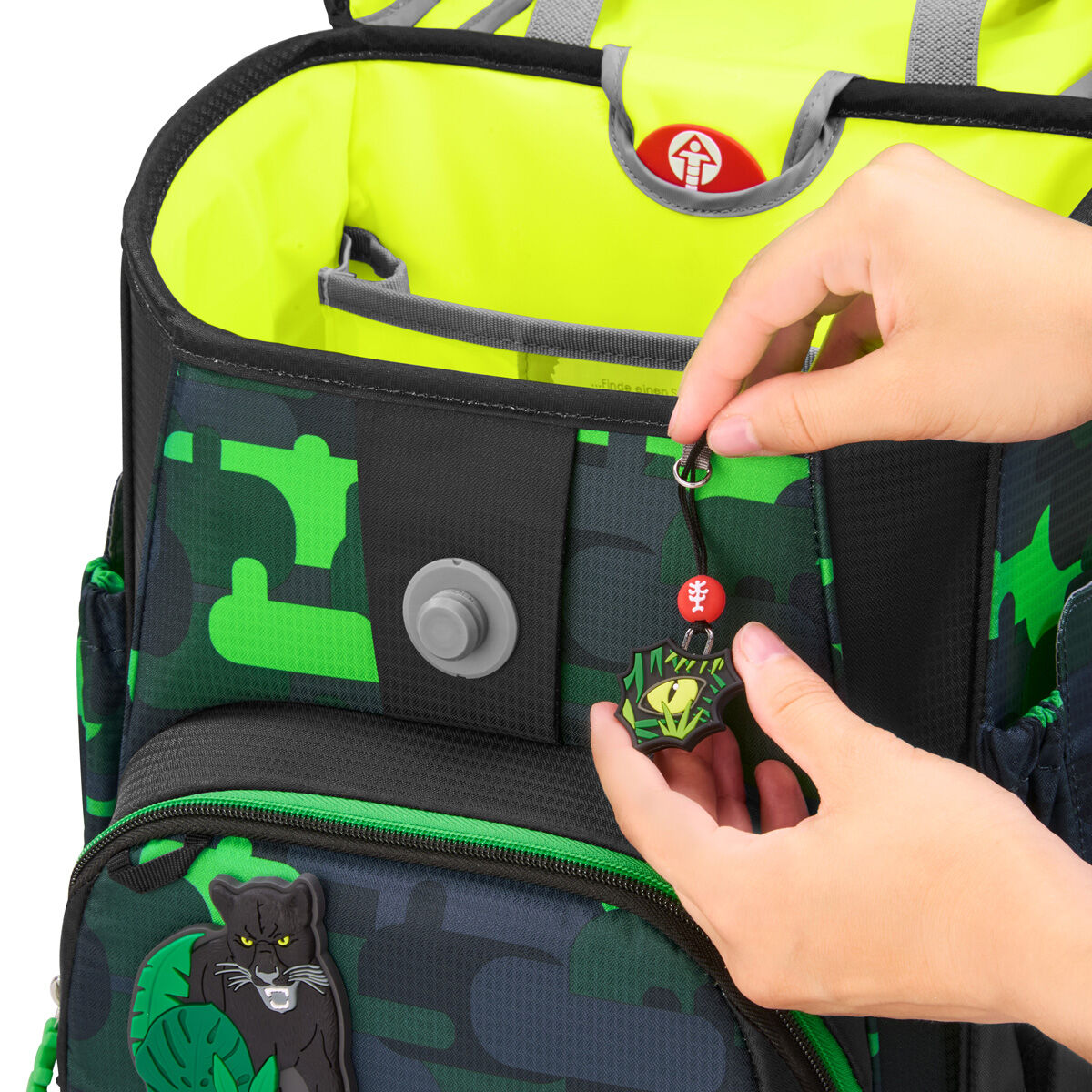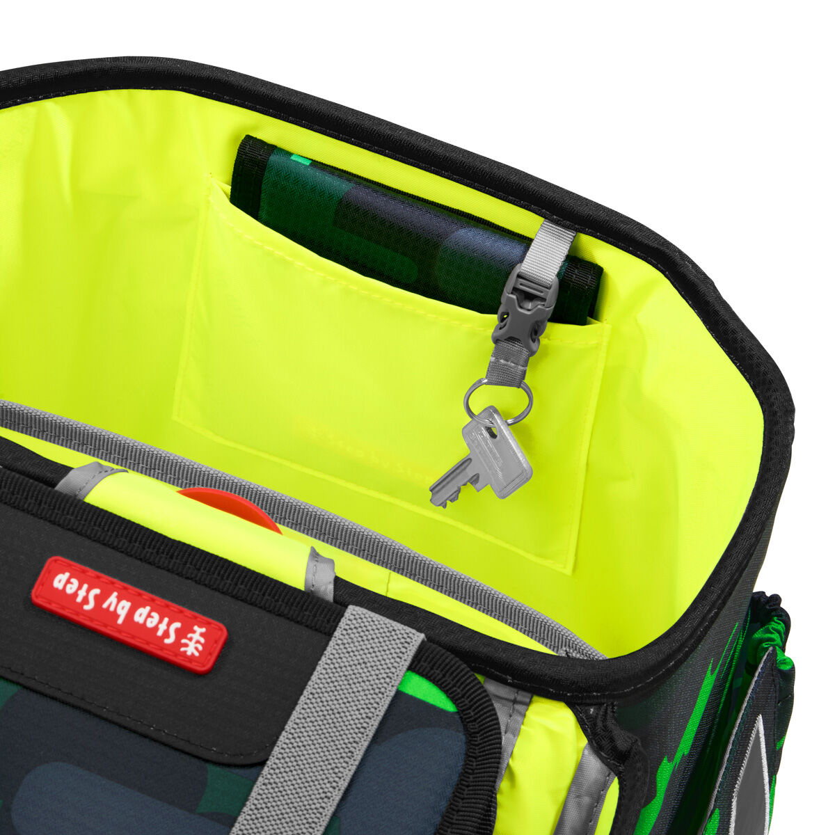 - Kleines Fach mit Schlüsselanhänger im Hauptfach