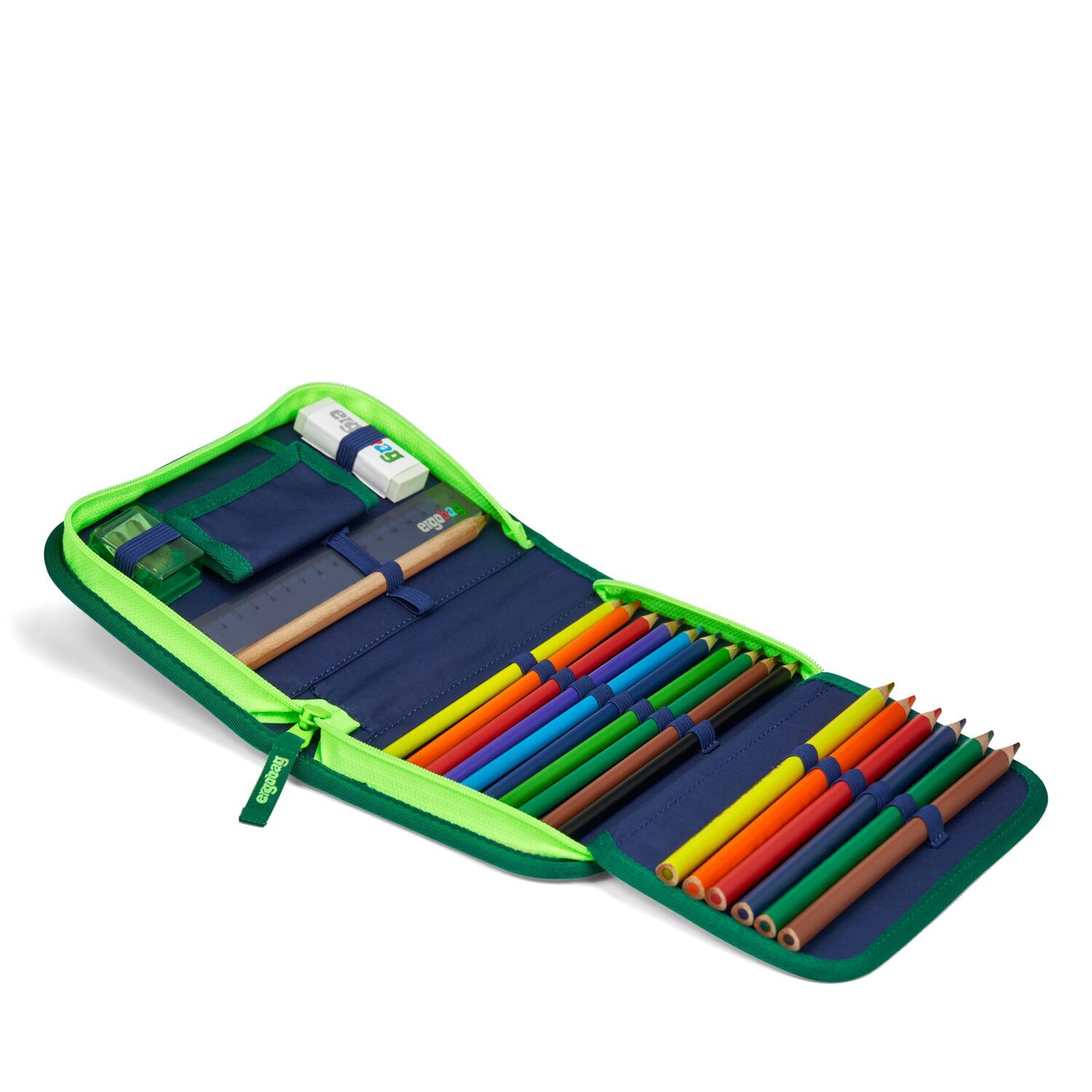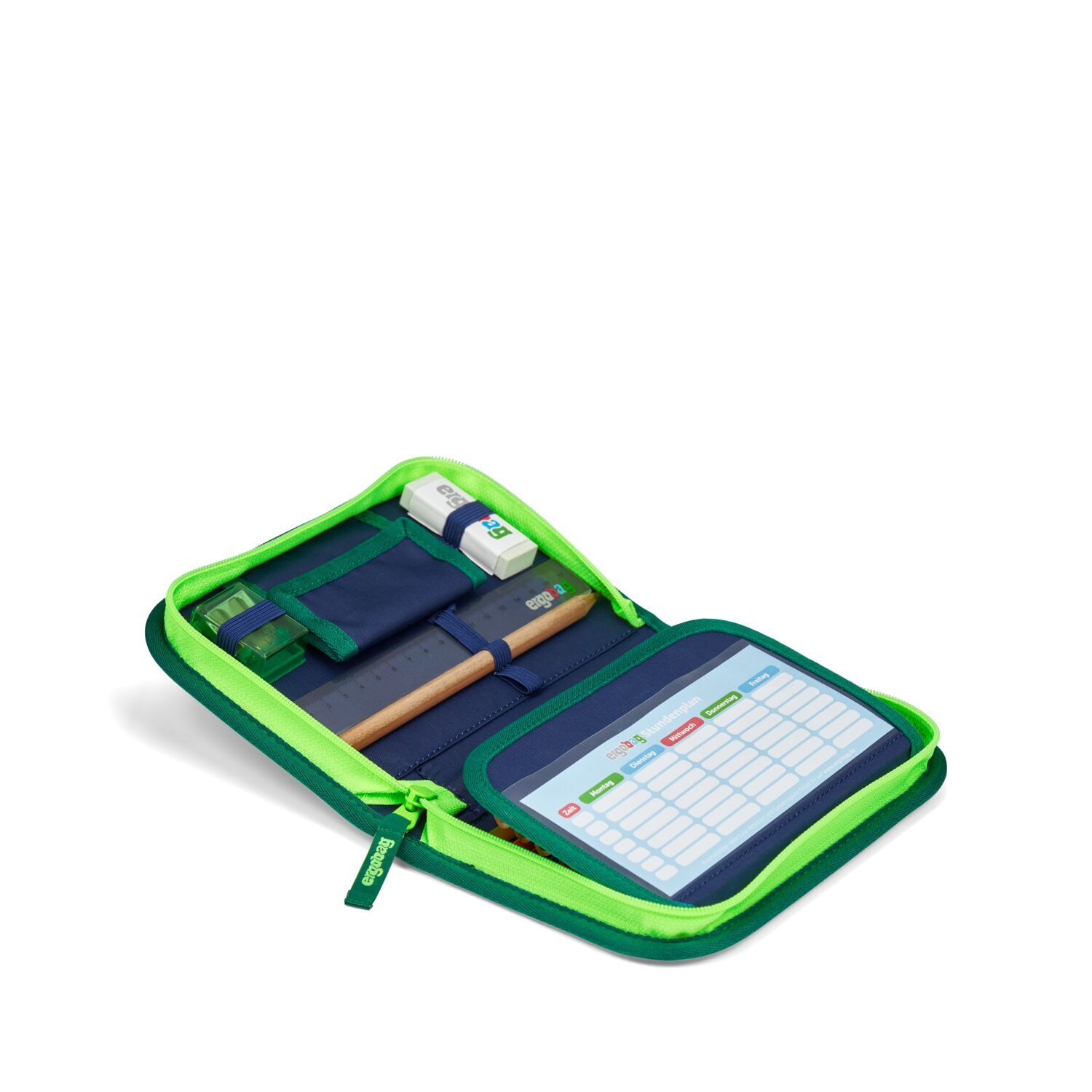 4. Federmäppchen Bestens ausgestattet (22-tlg.), finden neben 17 Stiften in Reih und Glied auch Radiergummi, Lineal, Spitzer und Stundenplan ihren Platz.