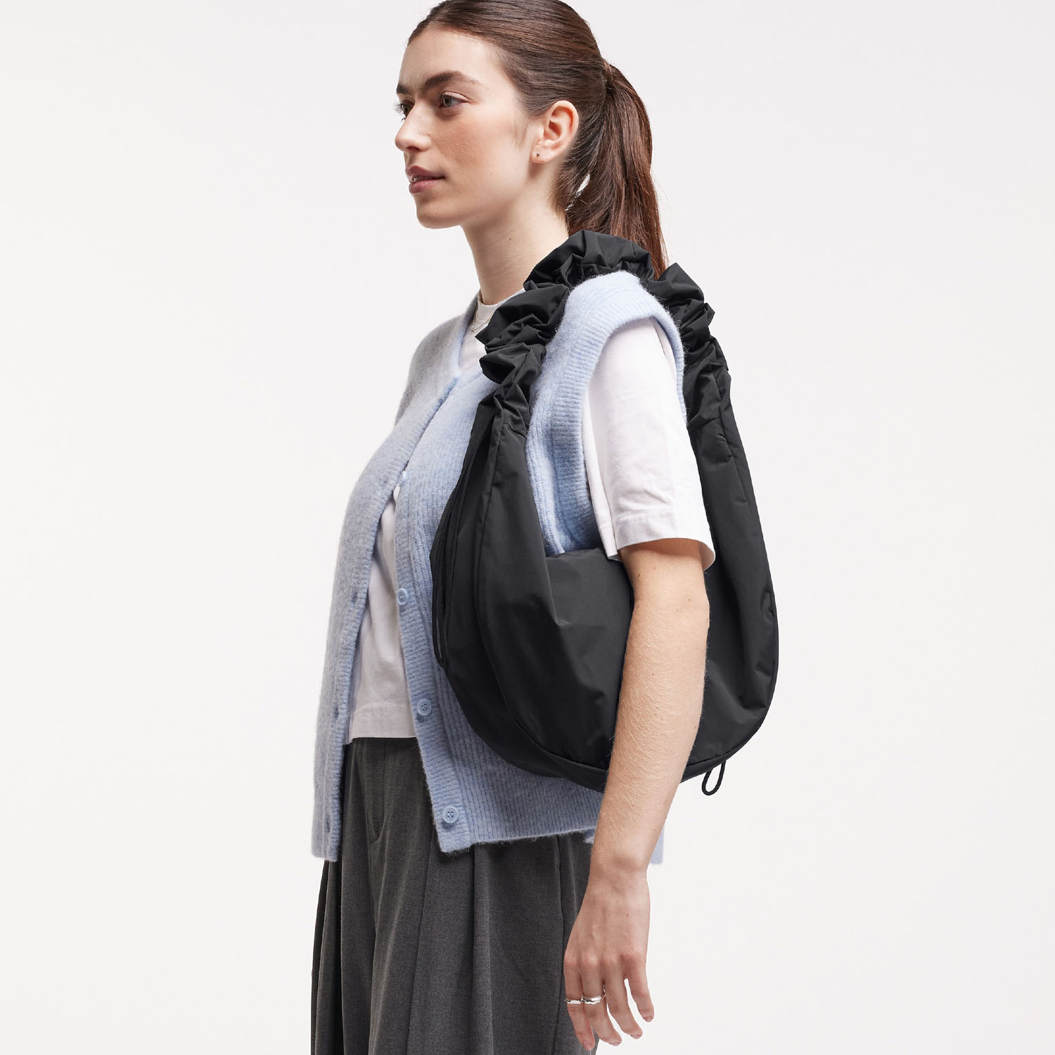 Dein 11-Liter-Raumwunder mit wasserabweisendem RE:NYNET®-Material – dank vielseitigem Ruffle-Design als Crossbody-Bag oder Schultertasche tragbar.