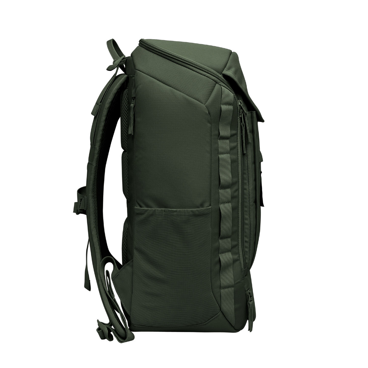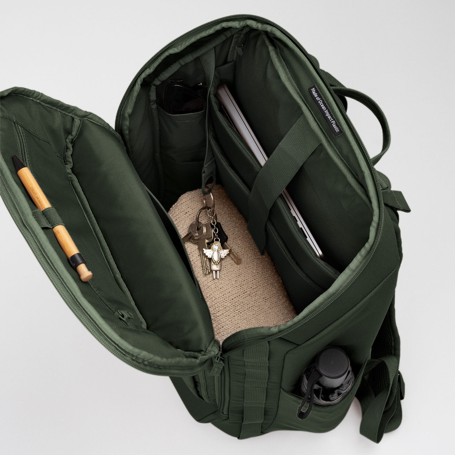 - RE:PET Hauptmaterial aus recyceltem Ocean Impact Plastic, Innenmaterial aus recyceltem PET, Mesh außen aus PA, Mesh innen aus recyceltem PA, Gummizug aus PET und Latex, Schnallen aus recyceltem PA, Webbänder aus recyceltem PET, Reißverschlüsse aus PA, Klett aus PA, Wattierung aus PE