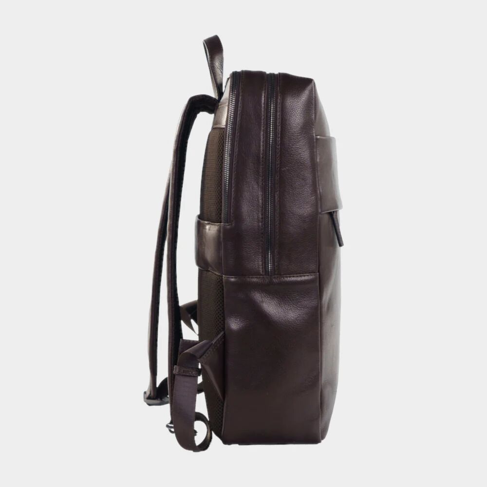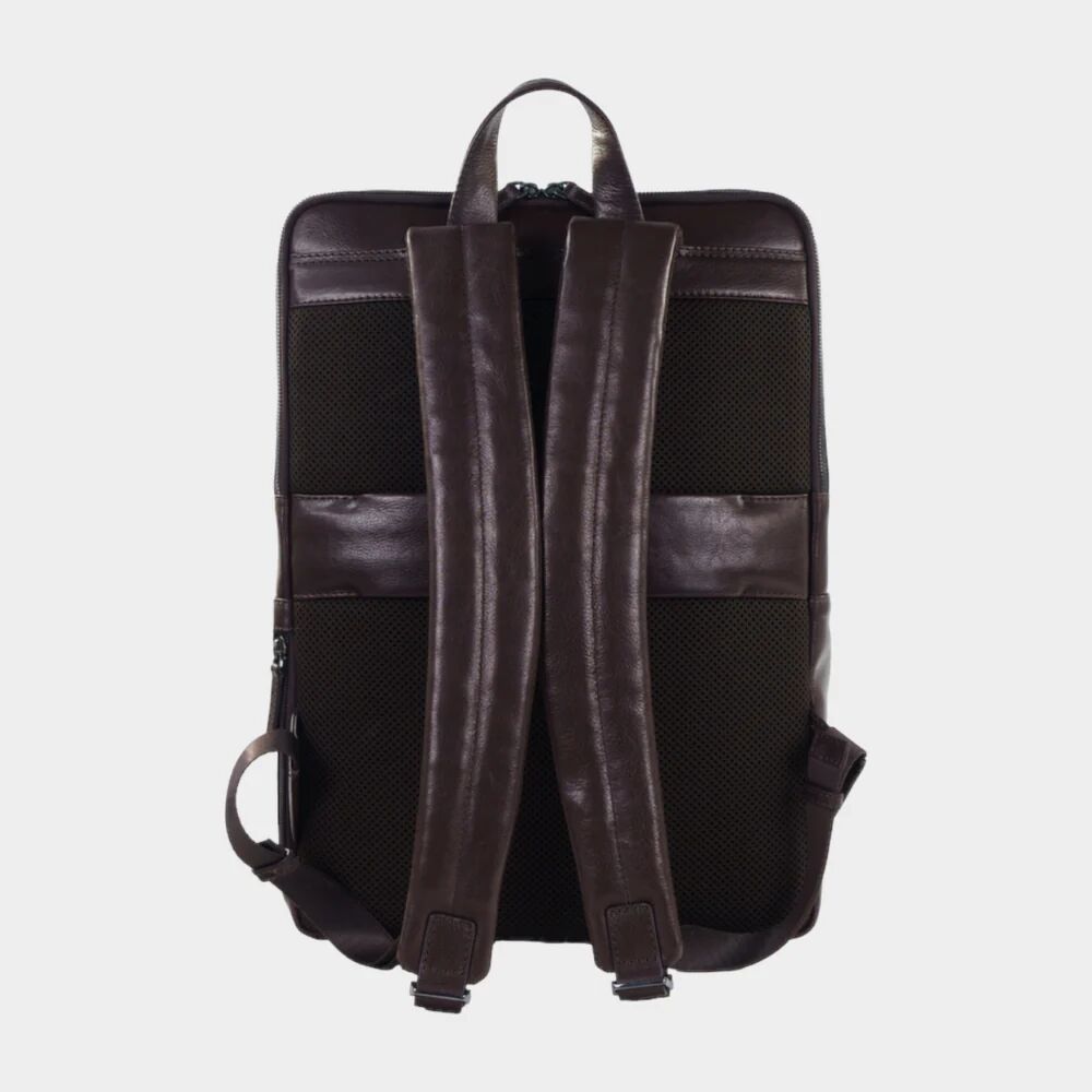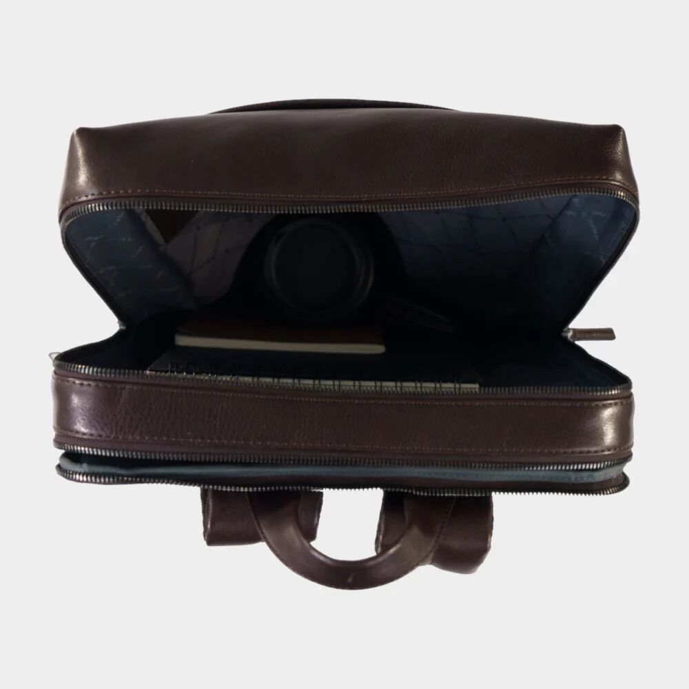 Die atmungsaktive Airmesh-Rückseite sorgt für Tragekomfort und verbirgt ein seitliches Reißverschlussfach zur einhändigen Nutzung. Eine integrierte Koffer-Aufsteckschlaufe aus Leder ergänzt die Reise-Funktion. Zwei Hauptfächer mit Zwei-Wege-Metallreißverschlüssen öffnen sich zu einer strukturierten Innenaufteilung: Im rückwärtigen Fach befinden sich ein gepolstertes Laptopfach für Geräte bis 17 Zoll, ein iPad-Fach passend bis 13 Pro Modelle, sowie ein großes Steckfach für Dokumente.