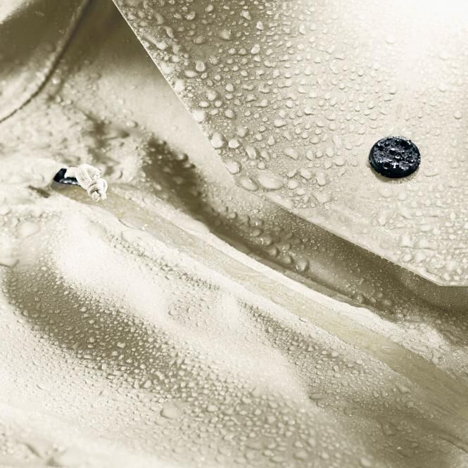 Ein sehr widerstandsfähiges 420 den Polyamid-Gewebe, das durch seine hohe Webdichte äußerst abriebfest wird. Eine TPU Beschichtung auf der innenseite und die FC freie DWR auf der Aussenseite machen das Gewebe auch unter extremen Bedingungen Wasserdicht. Glänzende Oberfläche.