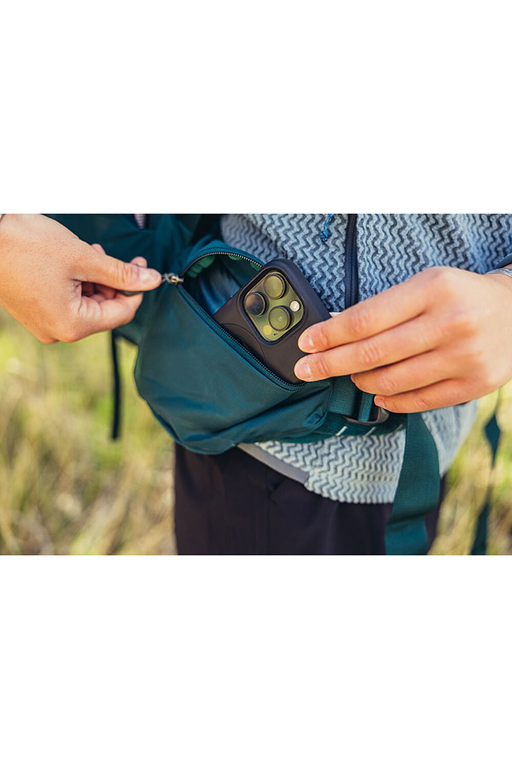 In der Stecktasche am Schultergurt ist Platz für ein Garmin inReach , deinen Lieblingssnack oder deine Sonnenbrille.