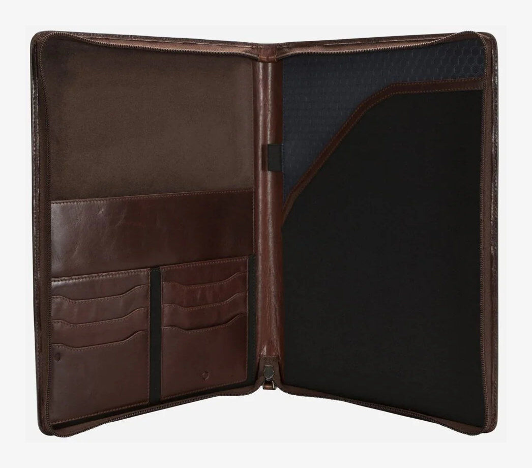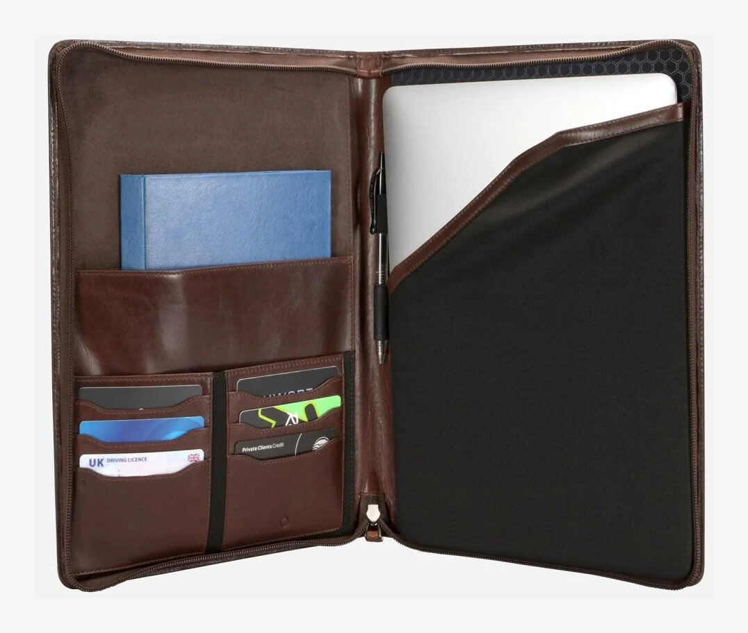 Nehmen Sie Ihr Büro überallhin mit – mit dieser geräumigen Leder-A4-Mappe. Sie bietet Platz für ein 13"-Laptop, Karten, Stifte und Dokumente.