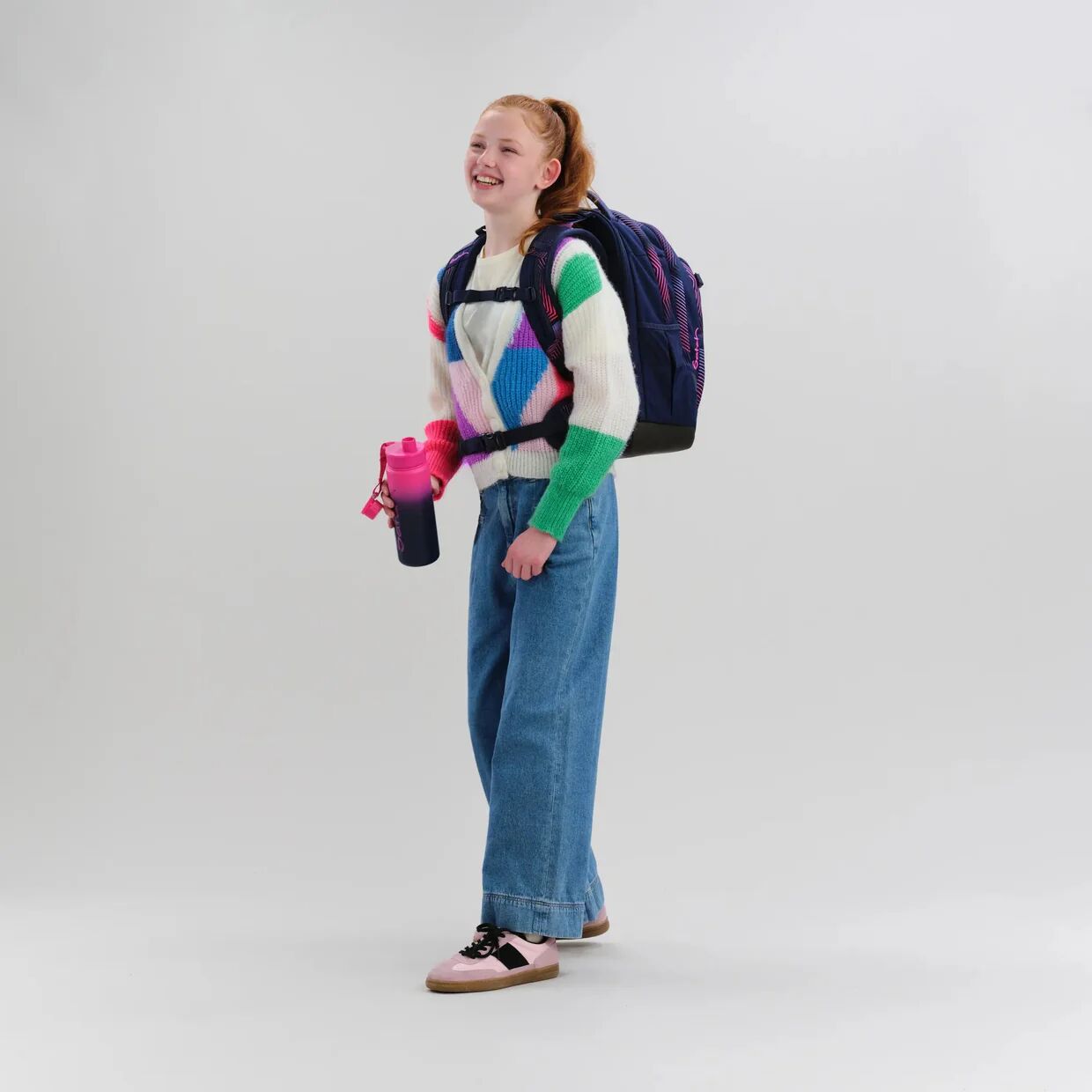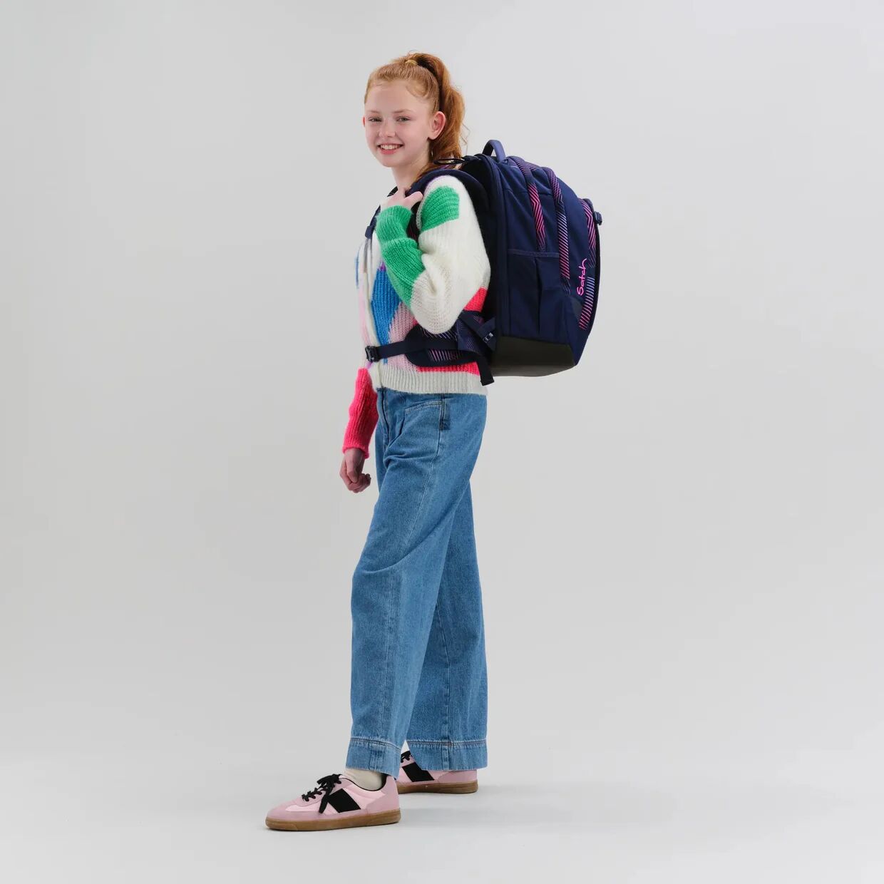 - Für unsere satch Produkte verarbeiten wir nachhaltige Textilien, die bis zu 100% aus recycelten PET-Flaschen hergestellt sind.