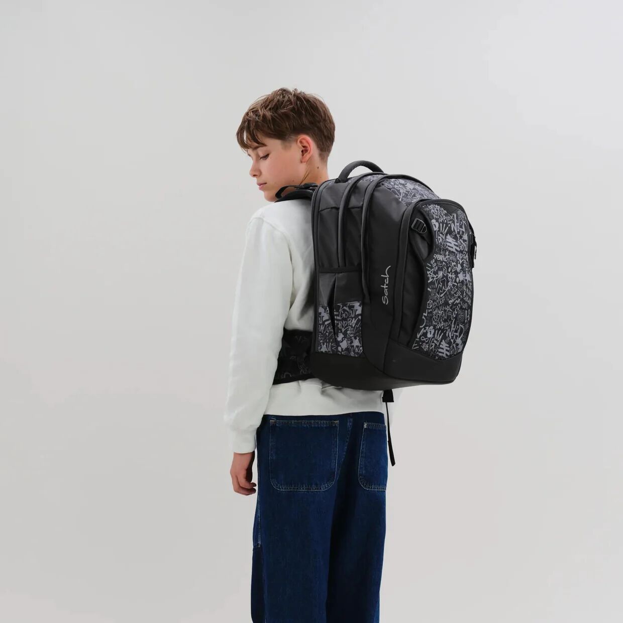 - Für unsere satch Produkte verarbeiten wir nachhaltige Textilien, die bis zu 100% aus recycelten PET-Flaschen hergestellt sind.