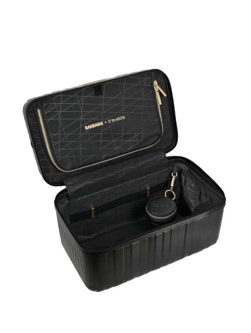 Der geöffnete Kosmetikkoffer von BARBARA & travelite zeigt das geräumige Innenfach, ein Reißverschlussfach sowie ein rundes Etui als Zubehör.Das BARBARA & travelite Beautycase ist das perfekte Extra und sorgt für ein Wohlfühlerlebnis auch abseits des Scheinwerferlichts. Ein praktisches Fach im Inneren des Deckels bieten Platz für Pinsel und Beauty-Accessoires, während die Aufsteckfunktion außen eine einfache Befestigung am Koffer ermöglicht.
